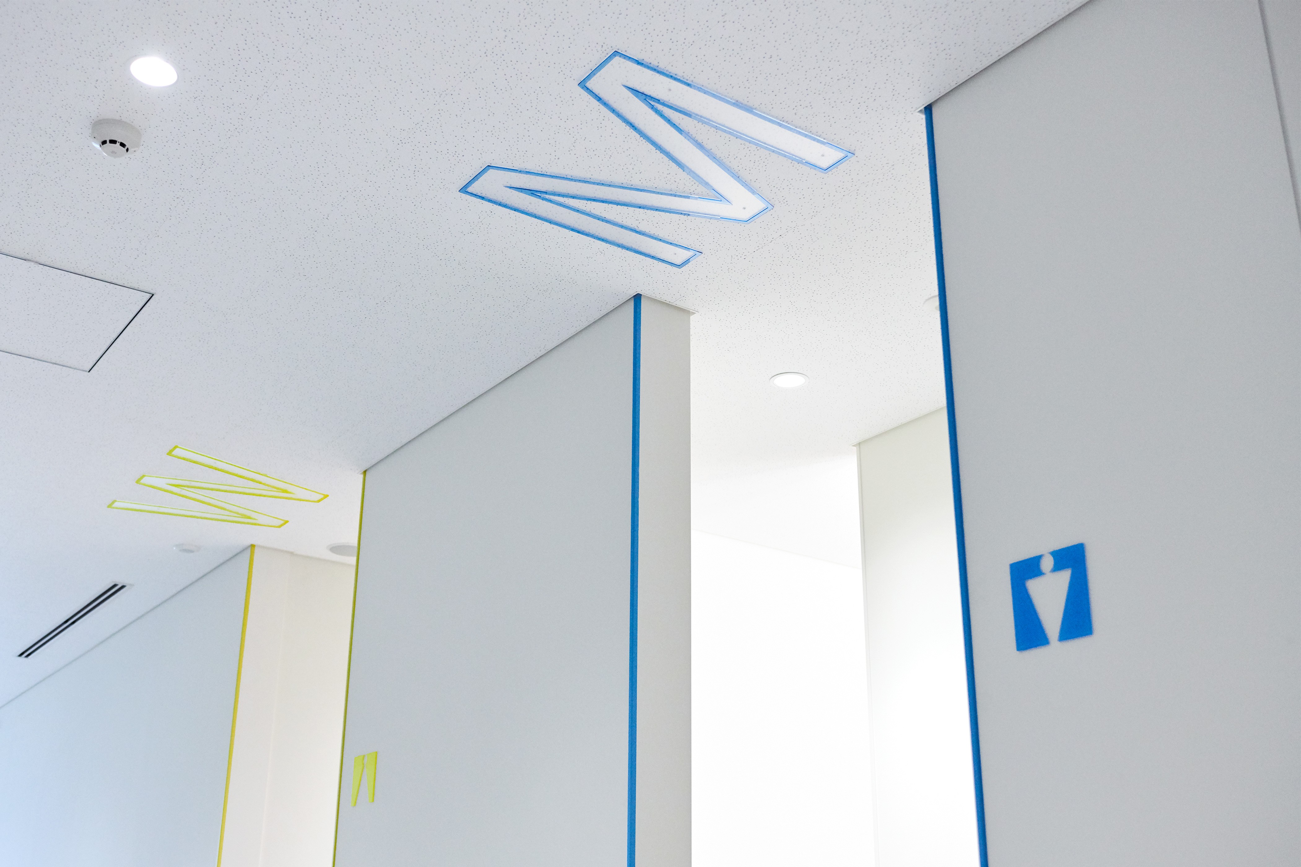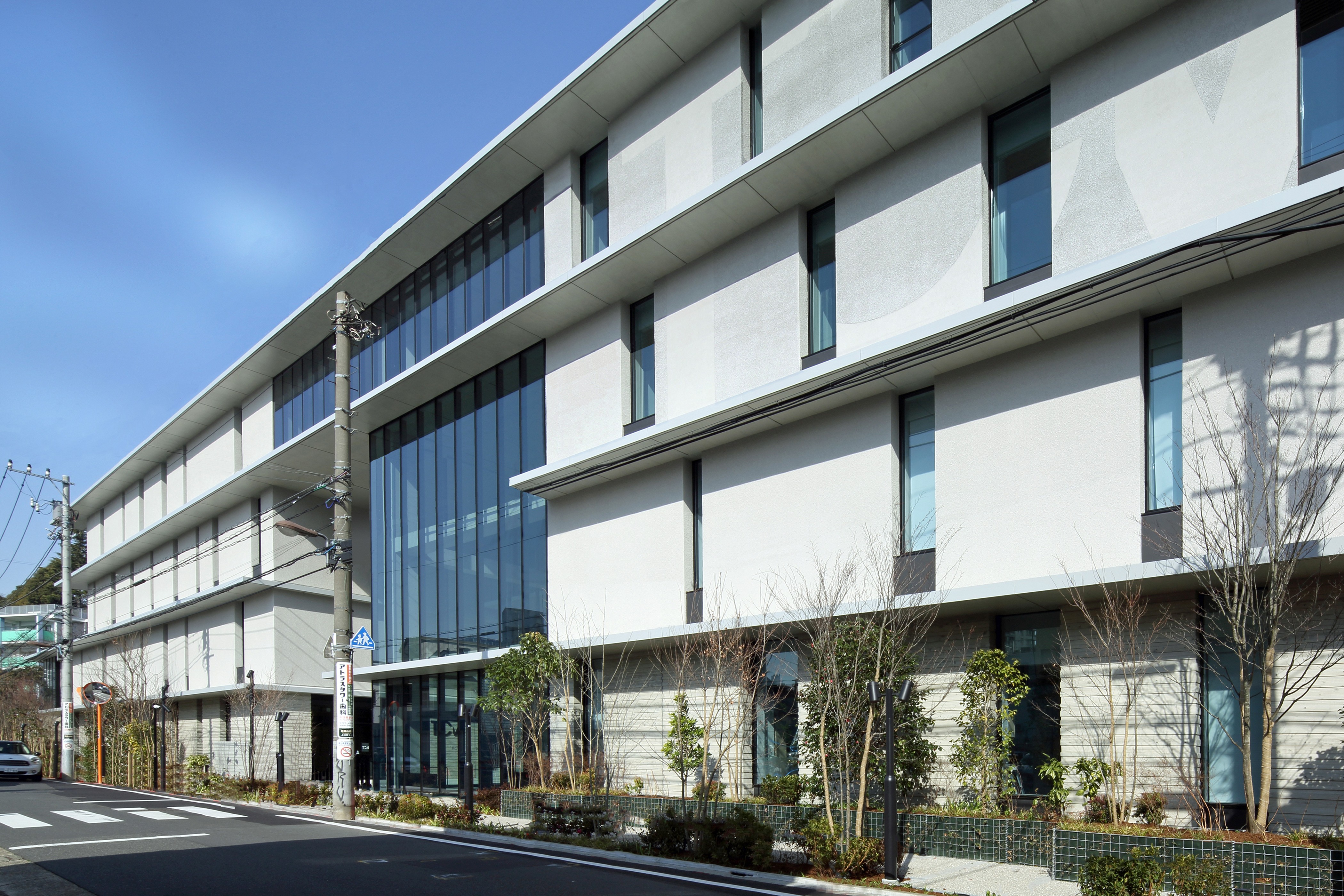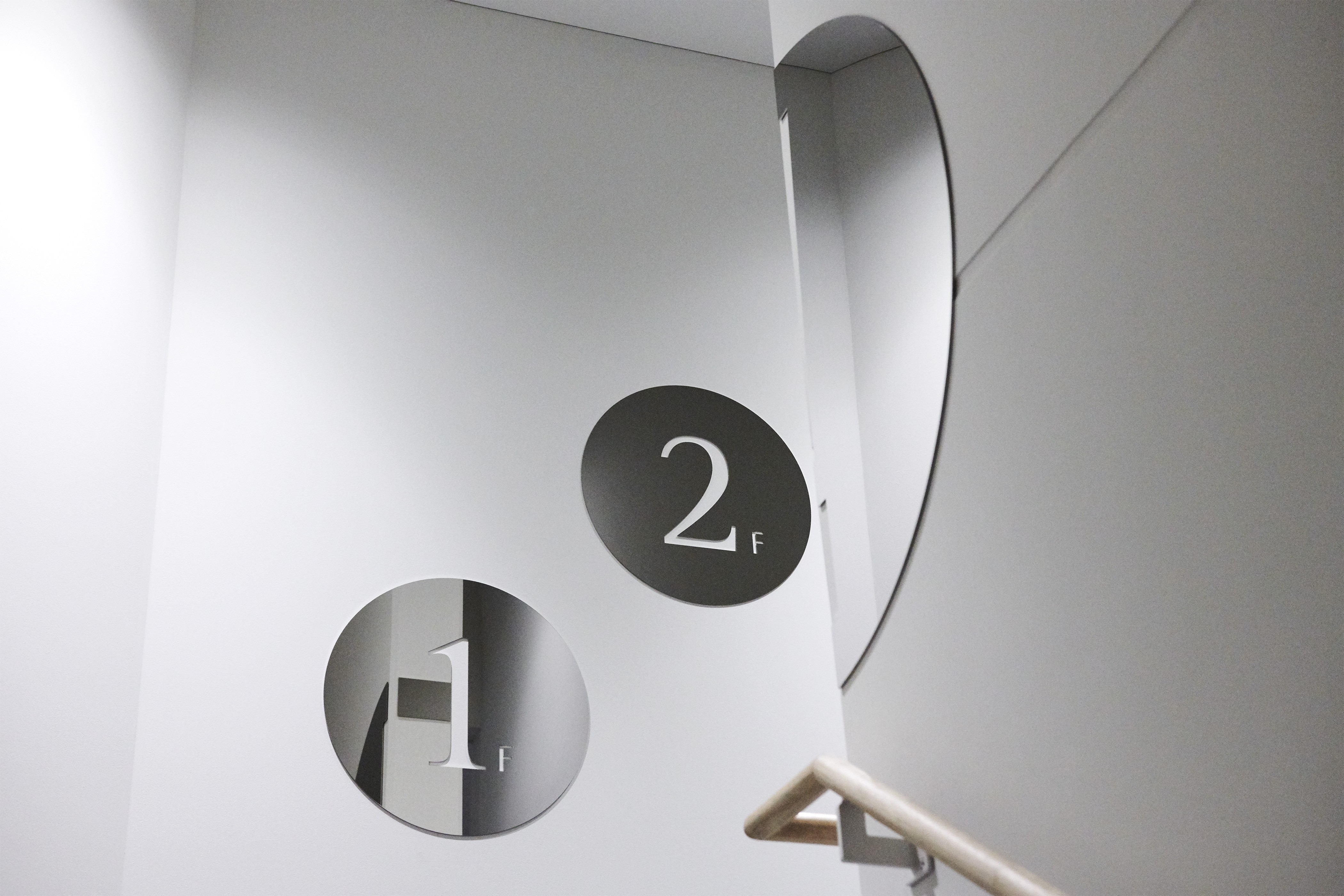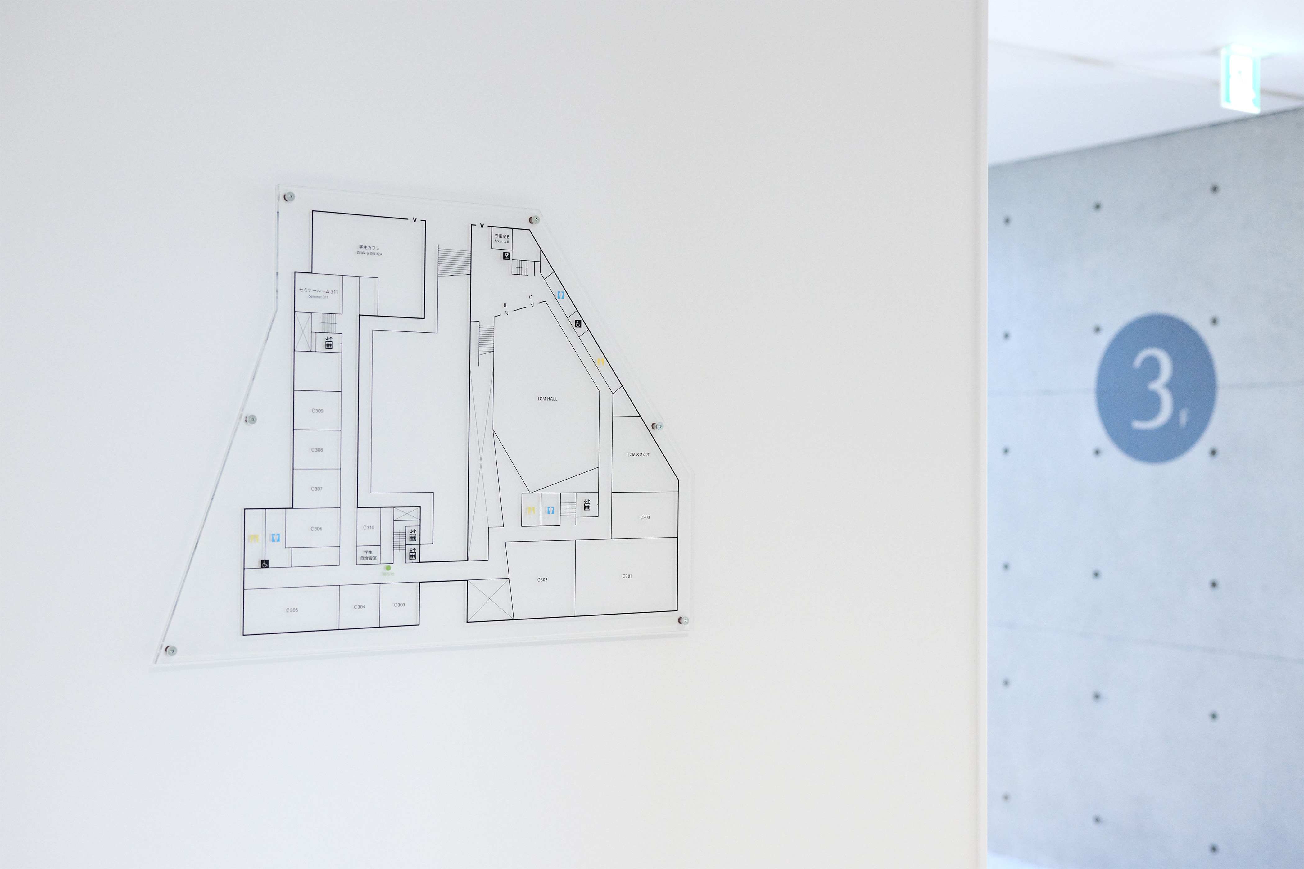 サインもVIデザインのコンセプトと同様にキャンパスを使用する人たち、街並みや街を歩く人々の目に緩やかに溶け込むようなデザインを意識し設計した。建物正面の外観の左官部分は、塗りの目の方向を変えてロゴを浮き彫りにすることで、街並みや歩く人々の目に緩やかに溶け込むようデザインした。また、建物のロゴには鏡面素材を用い、ロゴに映る風景が目線の高さや見る角度によって表情豊かに変化する。