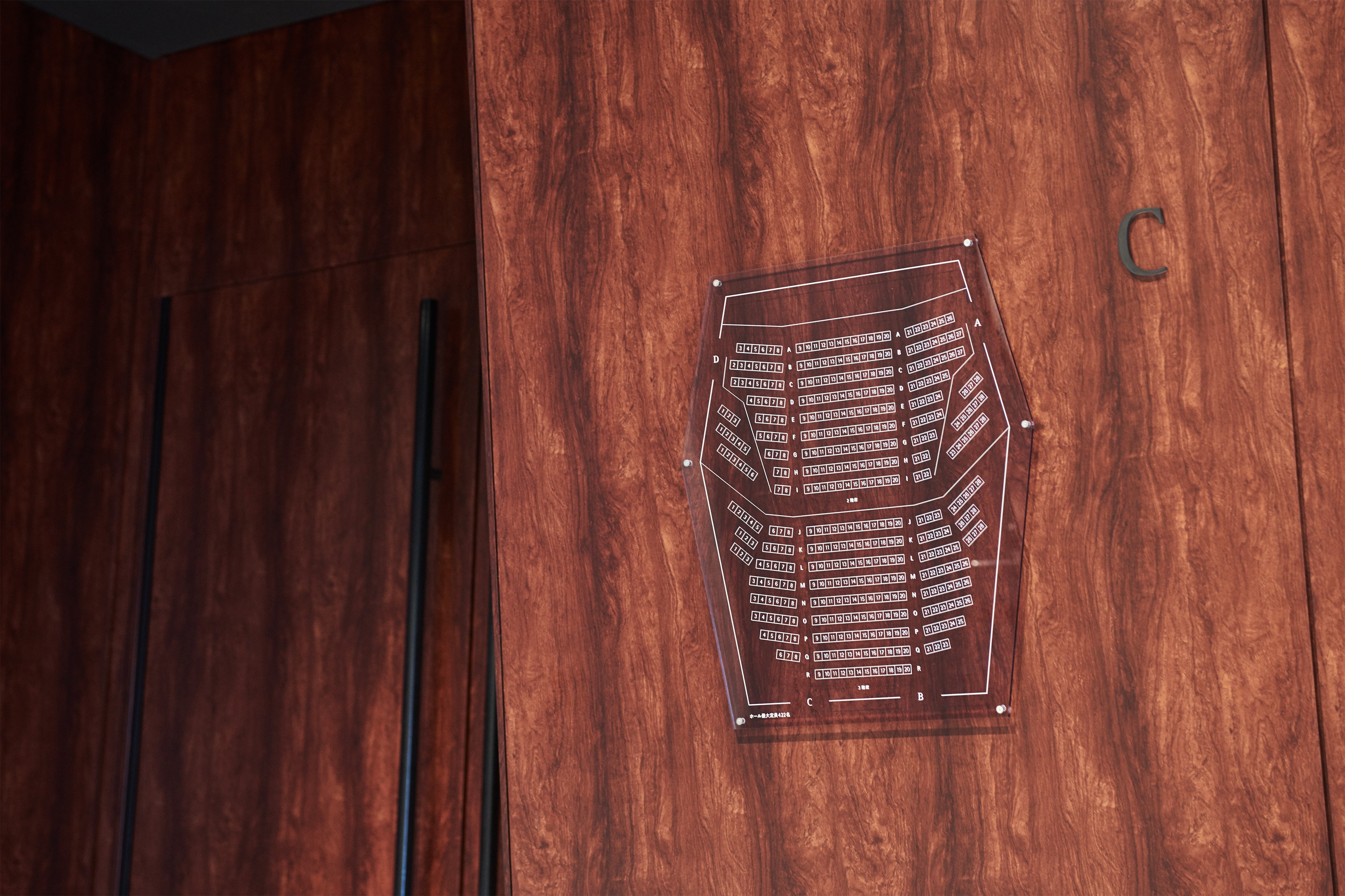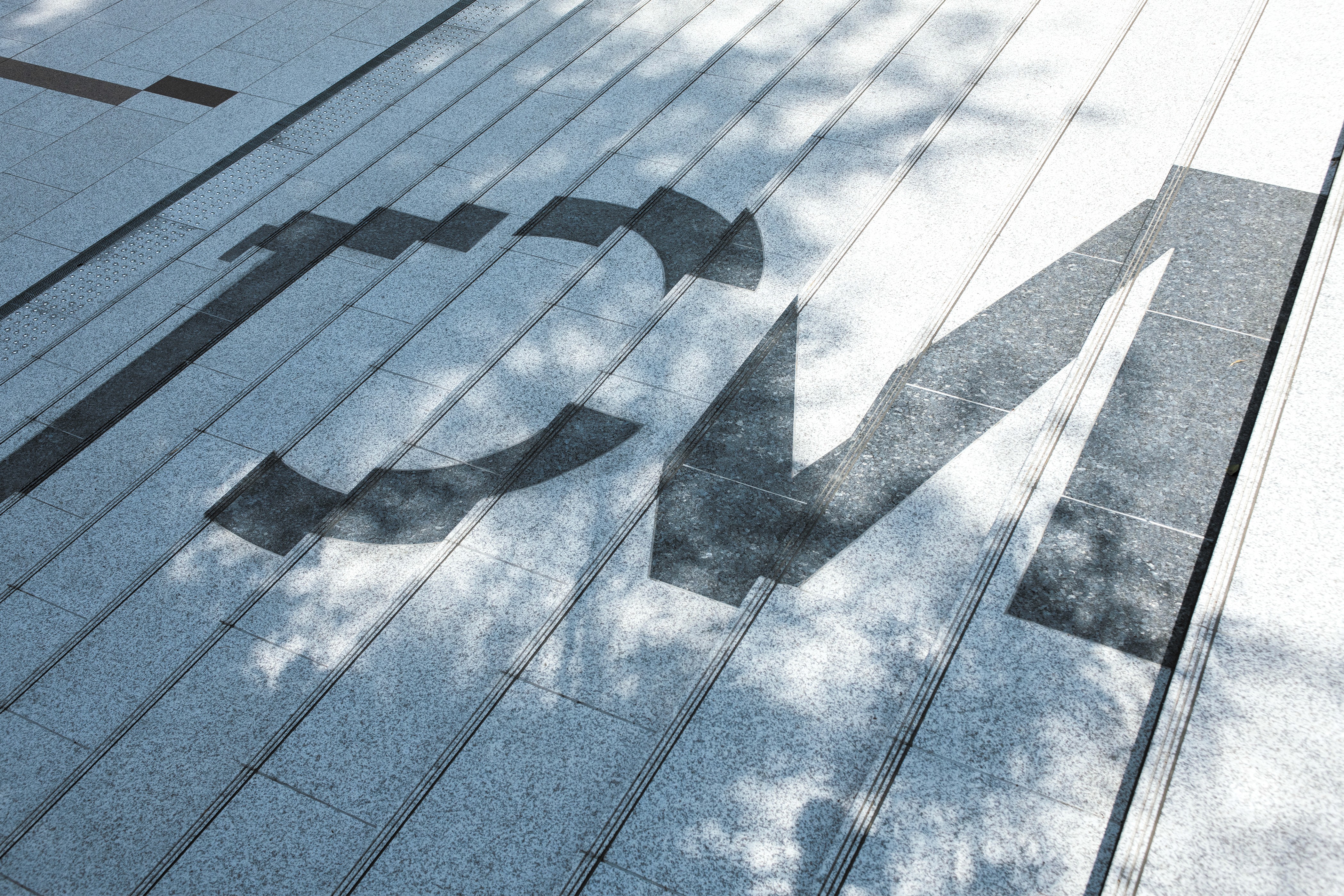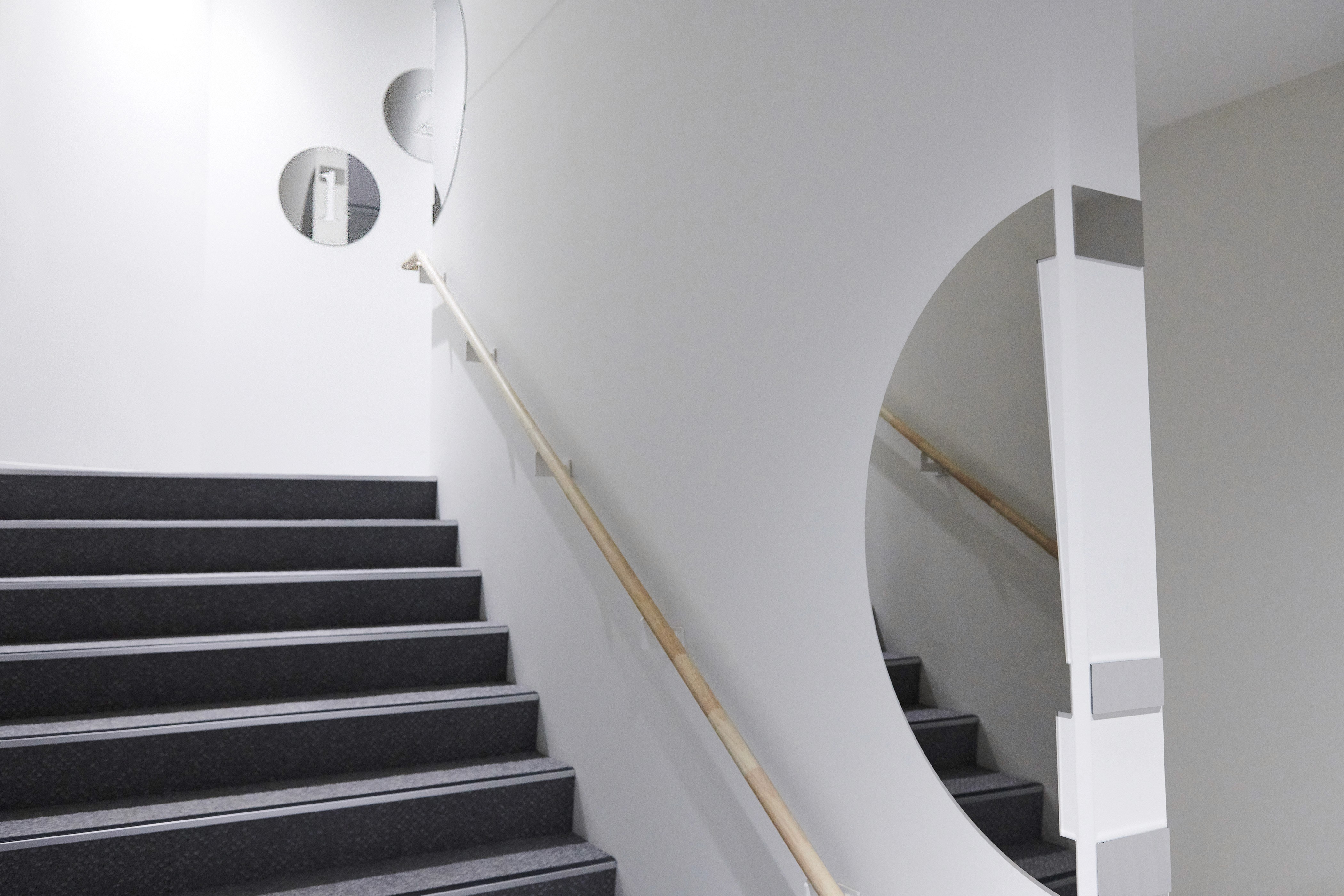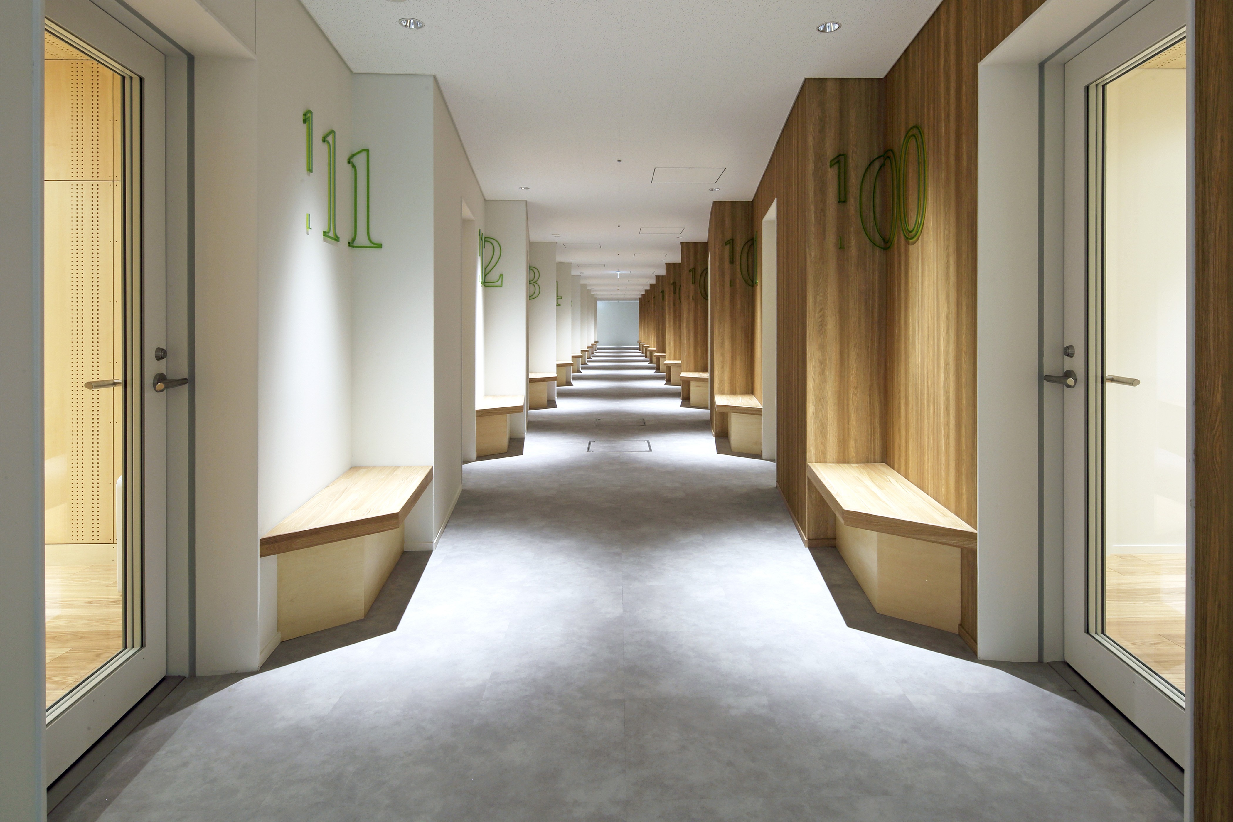 サインもVIデザインのコンセプトと同様にキャンパスを使用する人たち、街並みや街を歩く人々の目に緩やかに溶け込むようなデザインを意識し設計した。建物正面の外観の左官部分は、塗りの目の方向を変えてロゴを浮き彫りにすることで、街並みや歩く人々の目に緩やかに溶け込むようデザインした。また、建物のロゴには鏡面素材を用い、ロゴに映る風景が目線の高さや見る角度によって表情豊かに変化する。